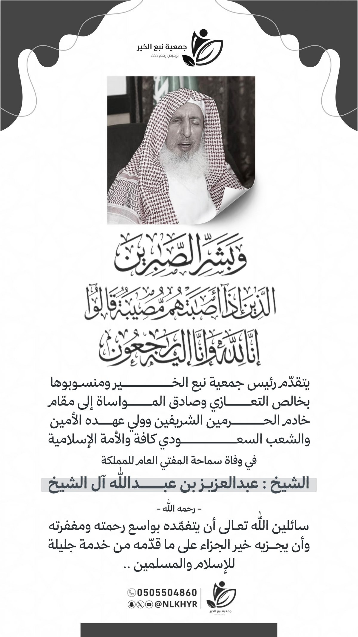تعزية بوفاة سماحة المفتي العام للمملكة الشيخ: عبدالعزيز بن عبدالله آل الشيخ